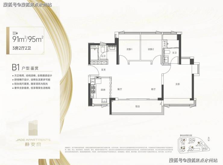 建面约91/95㎡产品为3房2厅2卫设计,户型更为方正,采用横厅设计,南北通透,采光、通风性能优异,空间也更加舒展。