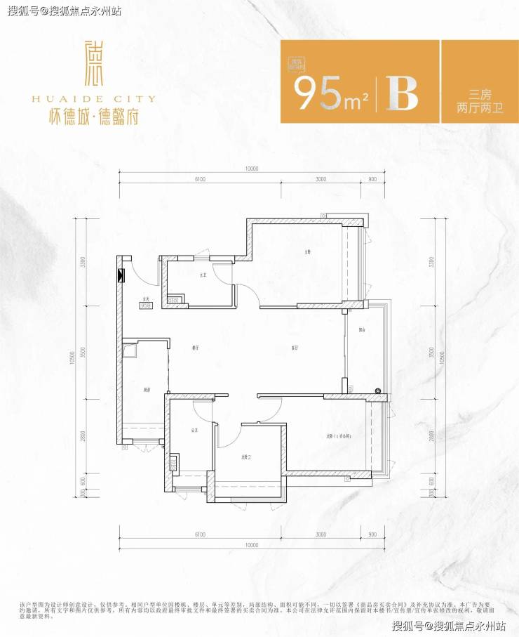 95㎡ 3房2厅2卫(B户型)设计的是竖厅双龙抱珠格局,进门独立入户玄关,客厅3.5米开间,主卧3.3米的宽度,其它2个次卧2.8米/2.6米的宽度,L型厨房,卫生间干湿分离设计。