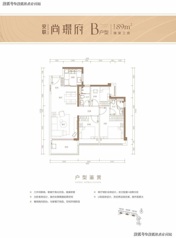建面约89㎡三房两厅两卫:采用动静分区设计,主要生活空间朝南,全尺寸采光面确保日照充足,客厅配备1.8米进深阳台,主卧为套房设计(含独立卫浴),次卧空间紧凑实用。U 型厨房与餐厅紧密相连,通风采光良好。