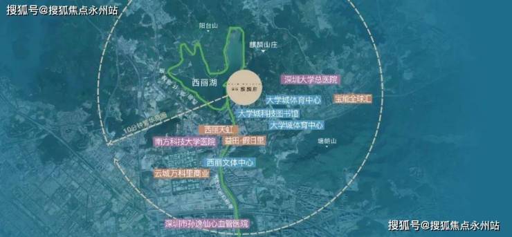 生态方面:项目位于西丽度假村,旅游休闲资源丰富,主打生态景观。高层西北侧可眺望西丽湖,东南侧被深圳野生动物园(有消息称动物园原址规划为高校用地,或搬去坪山)和西丽高尔夫俱乐部环抱,远看塘朗山公园。周边有西丽大学城,高校林立,人文气息浓厚。