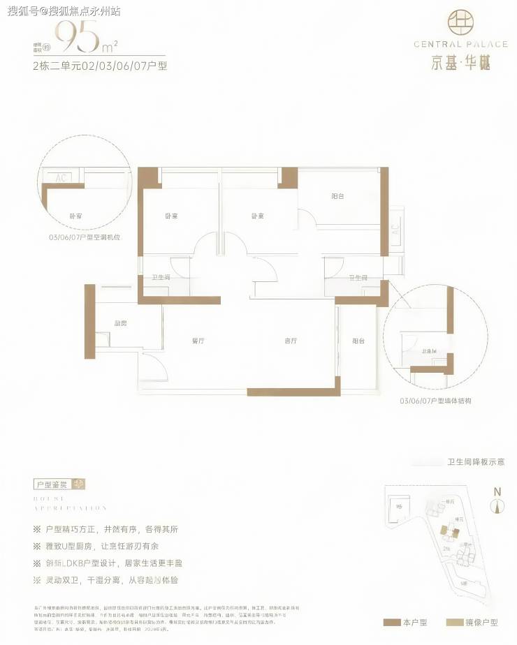 95㎡的3房2厅2卫,设计的是竖厅格局,创新LDKB一体化,L型厨房,卫生间干湿分离,得房率约73%(不含赠送),阳台有东南或西北朝向。