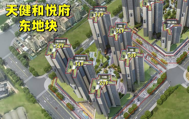 东地块,总占地面积约2.26万㎡,总建筑面积约14.43万㎡,计容建筑面积约10.37万㎡,容积率4.5,绿化率40%,共由6栋总高29-32层的住宅组成,其中7栋A单元住宅31F,7栋B/C单元住宅32F,8栋住宅31F,9栋住宅30F,10栋住宅29F,规划有公交首末站,社区菜市场。