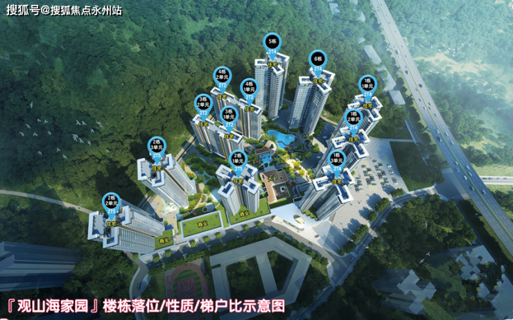 『远洋观山海家园』项目规划由12座住宅楼+裙房商业+花园景观廊架主体组成,1栋1-2-3单元23-24层,2梯4户;2栋1-2-3单元19-24层,2梯5户,3栋1-2单元和4栋1-2单元17层,2梯2户;5-6栋25层,2梯4户;裙房商业2-3层;花园景观廊架1层。