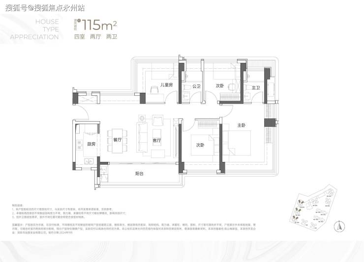 115㎡4房2卫-东南或西南朝向以及西北朝向,有3种户型格局,但整体差异并不大,都是横厅设计,阳台也都非常宽敞。主要核心区别是阳台的设计,这应该是为了贴合楼栋朝向、景观所做的调整。