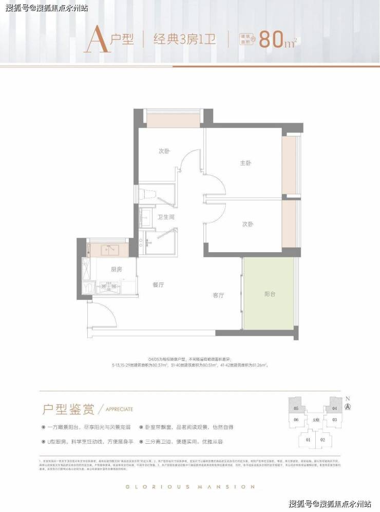 80㎡三房两厅一卫:设计的是竖厅格局,LDKB一体化,动静分区,次卧双飘窗设计,U型厨房,创新式三分离卫生间,阳台有朝正西向或正东向。