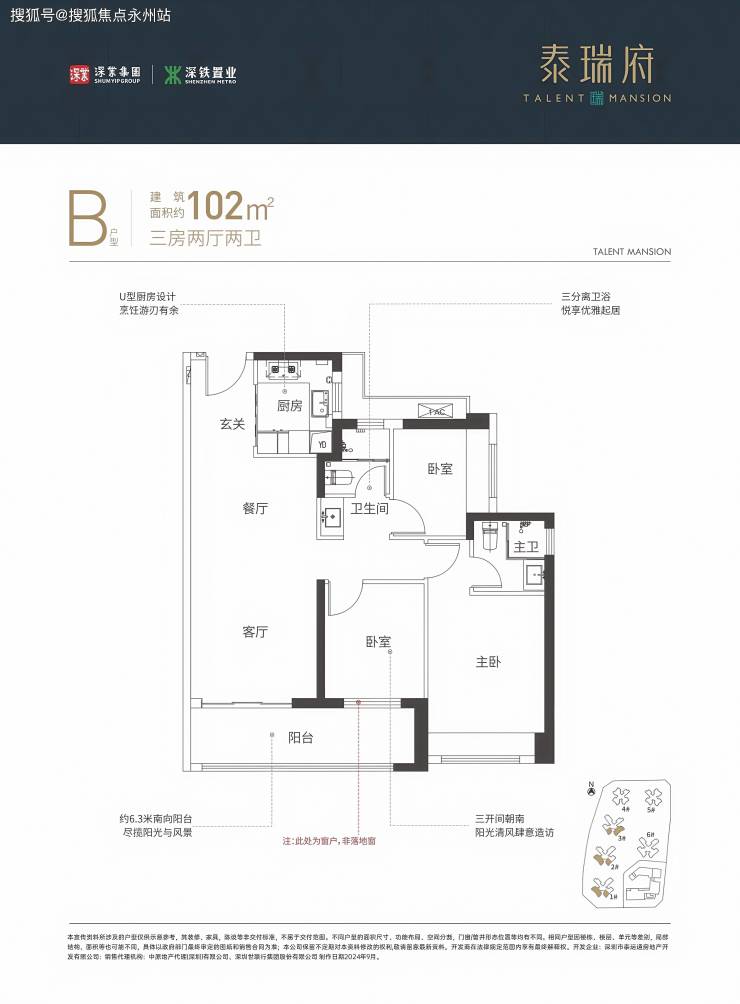 建面约102㎡3房2厅2卫(东南/西南朝向):主卧3.15米开间,配备独立卫浴(含淋浴屏)及 2.1 米进深飘窗,可改造为书房或休闲区,公卫采用三段式分离,提升多人使用效率,客厅开间3.5米,阳台延长至6.3米,可分隔为家政区与休闲区,U型厨房预留嵌入式烤箱位,满足进阶烹饪需求。
