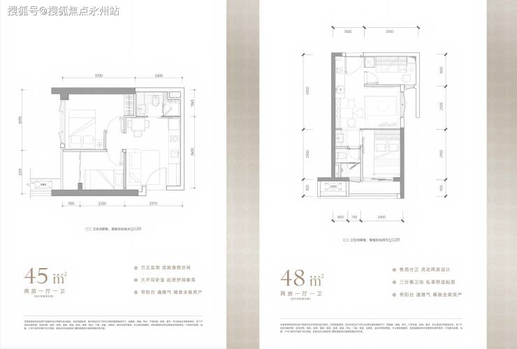 45-48㎡小两房:格局方正,可改造为两房,卫生间三分离设计,带阳台,总价195-240万,单价4万起。