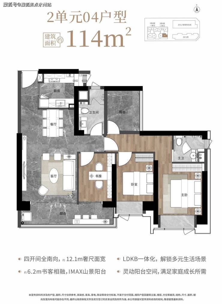 114㎡四房两厅两卫(1栋2单元04户型)四开间朝南,面宽达12.1米,客厅连接次卧形成6.2米超长观景阳台,正南朝向无遮挡,可同时俯瞰梧桐山、深圳河及香港打鼓岭景观。