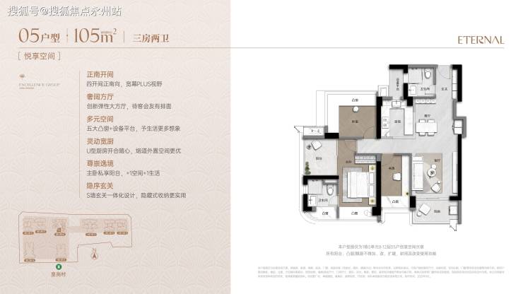 92㎡三房两厅两卫:采用"双龙抱珠"格局,竖厅设计,动静分区,客厅3.2米开间,主卧16.06㎡带270°环幕凸窗,七大凸窗+设备平台,正东向。