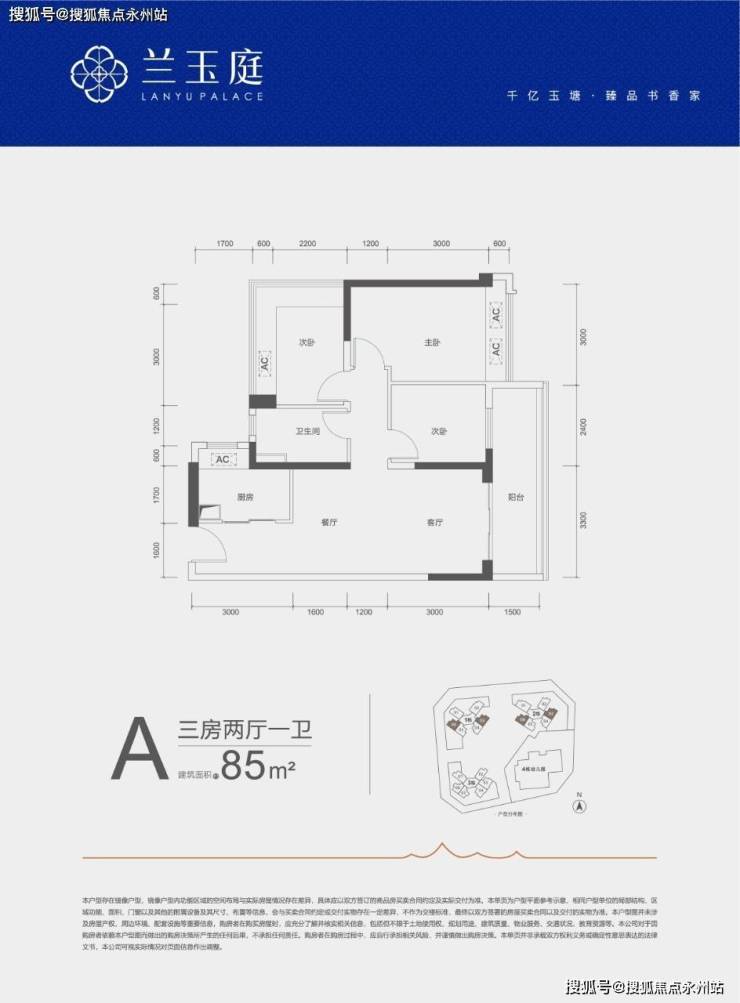 A户型—85㎡的3房2厅1卫:设计的是竖厅格局,客厅开间3.3米,LDKB一体化,三开间朝南,3个卧室分别做到了3米/2.8米/2.4米的宽度,客厅连接次卧出5.7米长的大阳台,L型厨房,得房率约79%(不含赠送),西南或东南朝向。