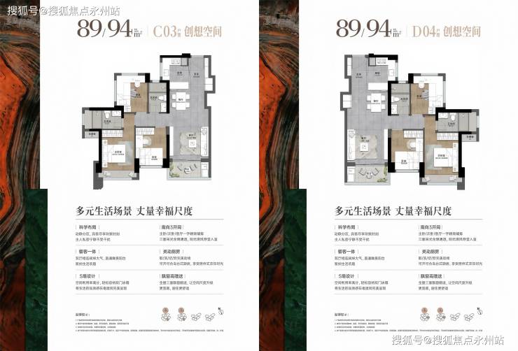 竖厅户型(03/04 户型):亮点:东南朝向,三开间朝南,S 墙设计优化空间动线。