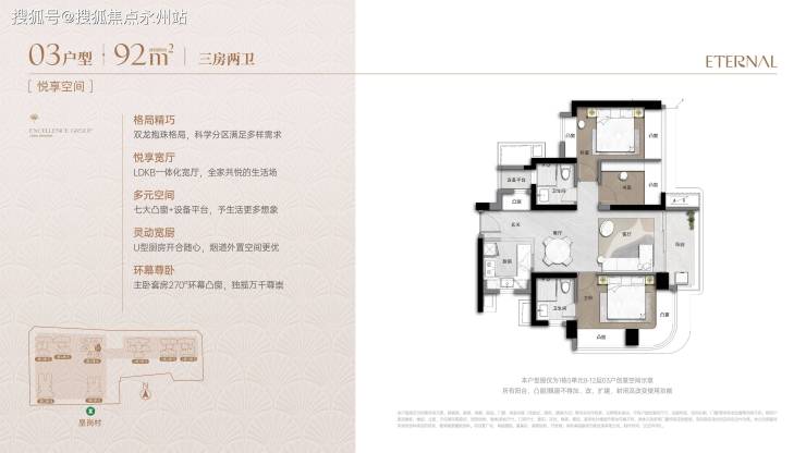空间创新:主卧三面采光,连通主卫、次卫与次卧的飘窗打破传统隔断,营造开阔空间感。