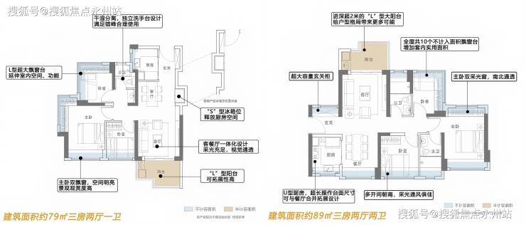 两种户型均通过飘窗(进深0.6-0.9米)、阳台(不计全面积)、设备平台等赠送空间,实际得房率达90%-93%(含赠送),远超市场同类型产品。例如,79㎡户型通过7个飘窗增加约 5㎡使用面积,89㎡户型通过10个飘窗+主卧套房设计,实现空间零浪费。