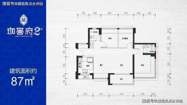 87㎡的3房2厅2卫,设计的是横厅南北通透格局,客餐厅6.2米开间,3个卧室分别为3.3/2.65/2.35米的宽度,主卧270°环幕飘窗视野,U型厨房,得房率:77.54%(不含赠送),阳台进深1.7米,主朝东南朝向。