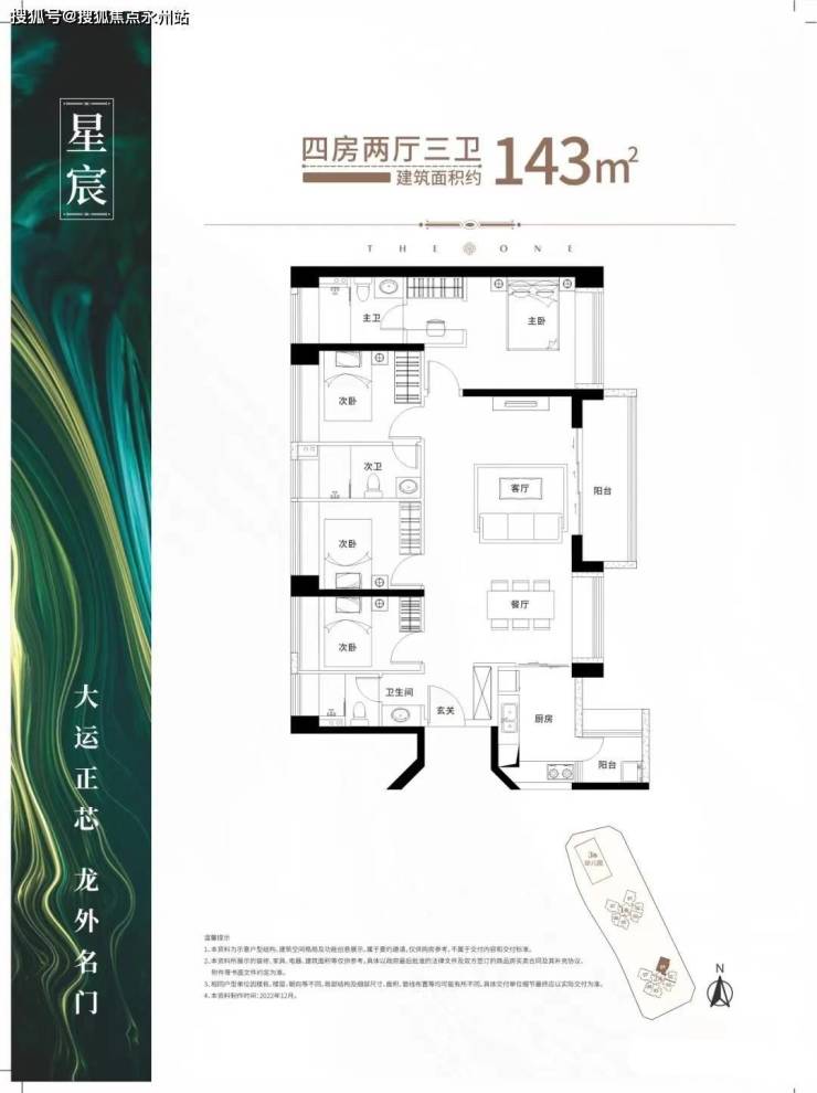 143㎡的4房2厅3卫,设计的是竖厅格局,进门入户玄关,餐客厅7.8米开间,4个卧室分别做到了3.5米/2.7米/2.7米/2.2米的宽度,双主卧套间,L型厨房,带1个生活阳台,公卫三段式分离,得房率:73.8%(不含赠送)阳台主朝东南向