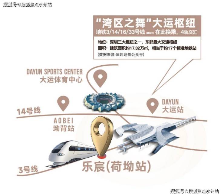 深圳东部最大的综合交通枢纽——大运综合交通枢纽,目前设有地铁3号线、14号线、16号线以及33号线(建设中)4轨交汇站点,覆盖深圳市东部发展轴和北部发展带,串联起福田中心区、罗湖、布吉、横岗、龙岗、坪山等片区。