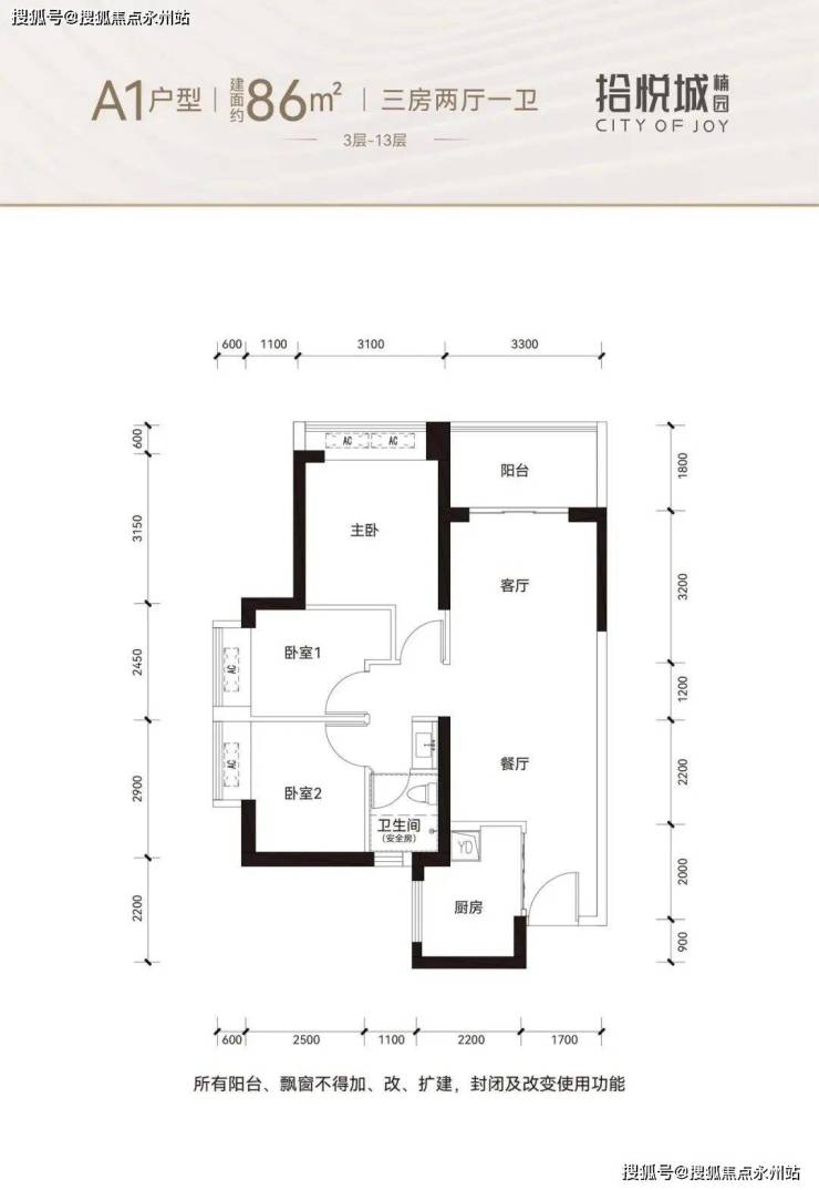 86㎡的3房2厅1卫,设计的竖厅格局,客厅3.3米开间,目前仅B座06户型有,东北朝向