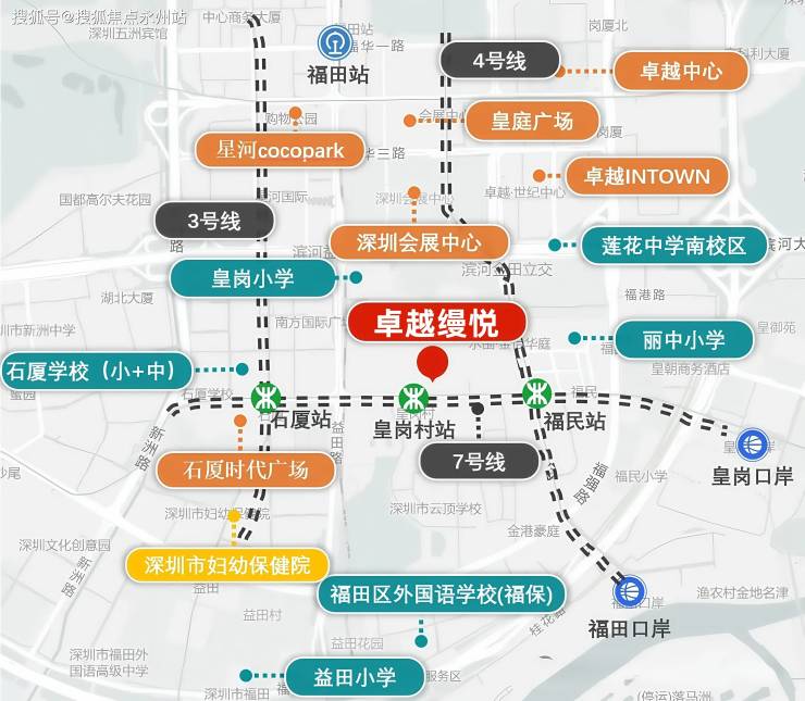 交通配套:4地铁环绕,从项目步行300米到7号线皇岗村站,3 站到福田站换乘高铁,4 站到会展中心,15 分钟直达香港。距4/10号线福民站约300米、3号线石厦站约500米。