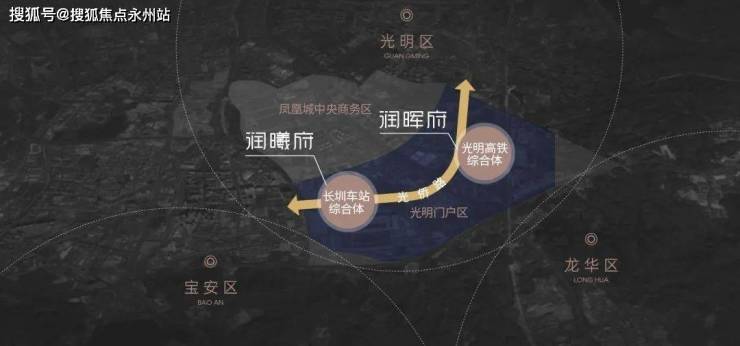 光明门户区,占据凤凰城“一环两轴三核”发展格局中的“一轴两核”。以一条光侨路为发展轴,串联光明高铁综合体与长圳车站综合体2大战略节点,共同打造“光明TOD中芯门户区”。