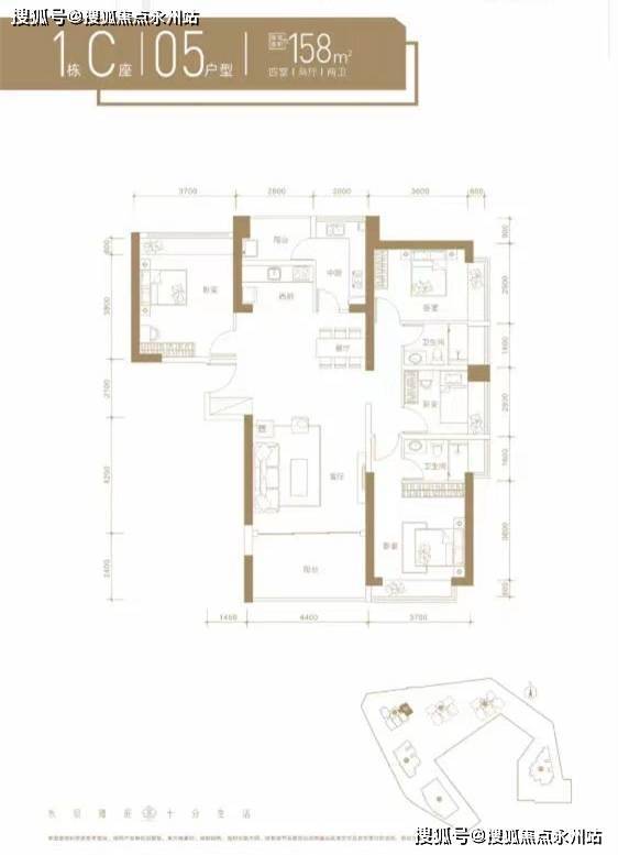约158㎡四房两卫(1栋C座05户型)竖厅格局,餐客一体化,客厅开间约4.4米,主卧开间约3.7米,卫生间干湿分离设计,东南朝向。