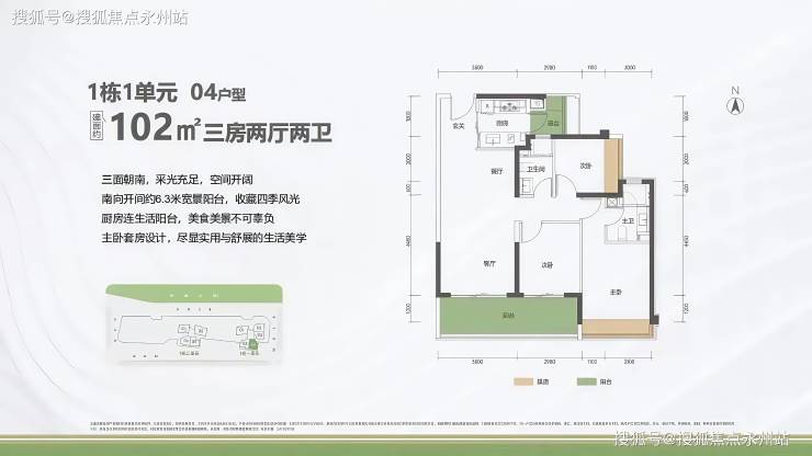 面积细分:99㎡与102㎡均为三房两卫,其中102㎡分布在1栋2 单元中高楼层,客厅开间更大(约4.2米),且部分房源可实现南北通透。