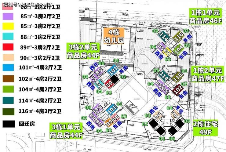 总规划1203户,可售商品房有901套,安置房56套,回迁房246套,1栋1单元3梯5户设计,其余栋数都是3梯6户设计,规划停车位1292个,车位占比约1:1.07。
