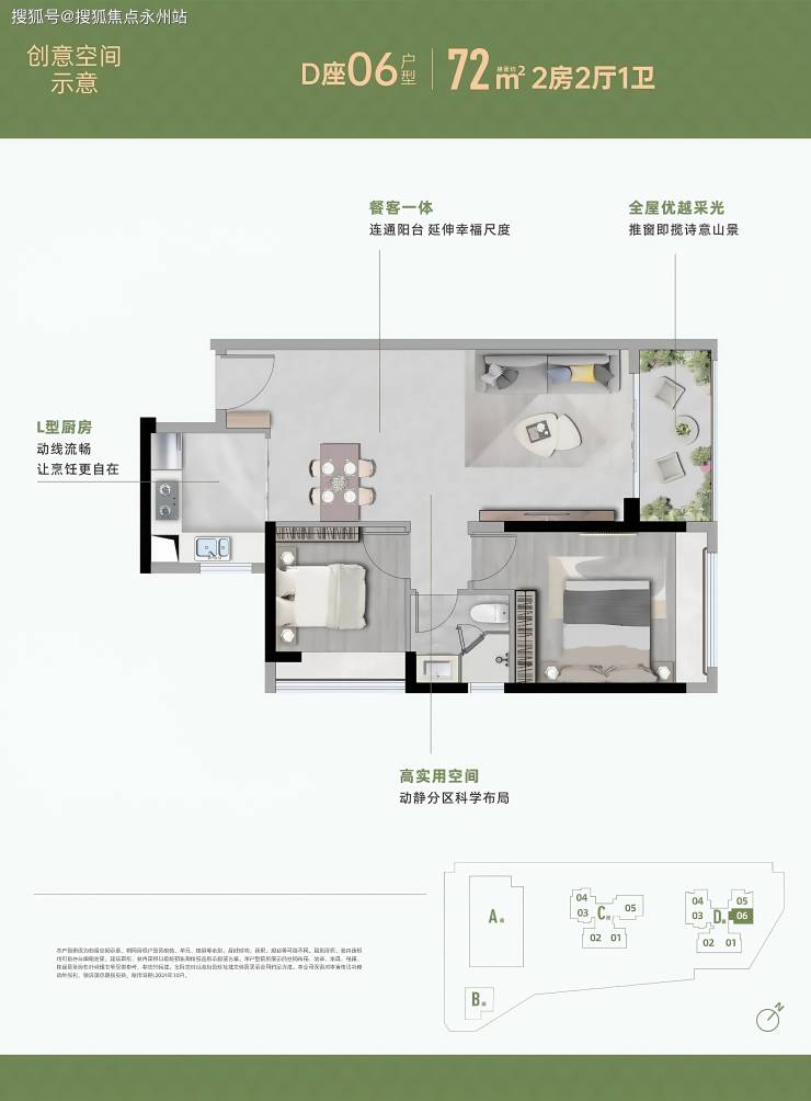 72㎡两房两厅一卫(竖厅格局):东北朝向,客厅 3.5 米开间,主卧 12.93㎡(含飘窗),次卧 9.99㎡,L 型厨房带独立采光窗,卫生间干湿分离,得房率:约 80%(不含赠送),为片区同面积段得房率较高的户型。