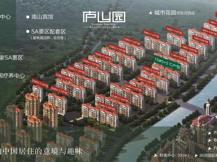 庐山园小区位于佛光养生谷内,环境优美、安静、悠闲,是最适合养生、养老的居住地。小区周边西邻国家5A级旅游度假区、高级森林公园,内有世界上较大的锡青铜坐佛—南山大佛,室内较大的药师玉佛,万佛朝殿、上下五千年、宗教文化园、历史文化园、华严世界等丰富旅游景点供您参观,每年共接纳30万人参观,小区的南侧修建了两条直通大佛的路,让您每天晨练都能与大佛来个亲密接触,佛光普照,保佑您一生健康、长寿;南侧即是大型的主题公园,内有:游乐场、跑马场、宠物乐园、民俗文化村、宋家大院、30米高瀑布等景点,周末可带领您的孩子进去轻松一把,享受一个快乐的周末,东望丹岭高尔夫全貌,视野开阔、环境怡人、绿草如茵、空气清新、最重要的是它能释放大量的负氧离子,负氧离子在空气中的含量与空气湿度、空气清新程度有密切的关系,小区独特的地理位置和自然环境创造了优质的条件,所以南山被誉为中华不老成养老基地,是您养生养老投资的优选之地。