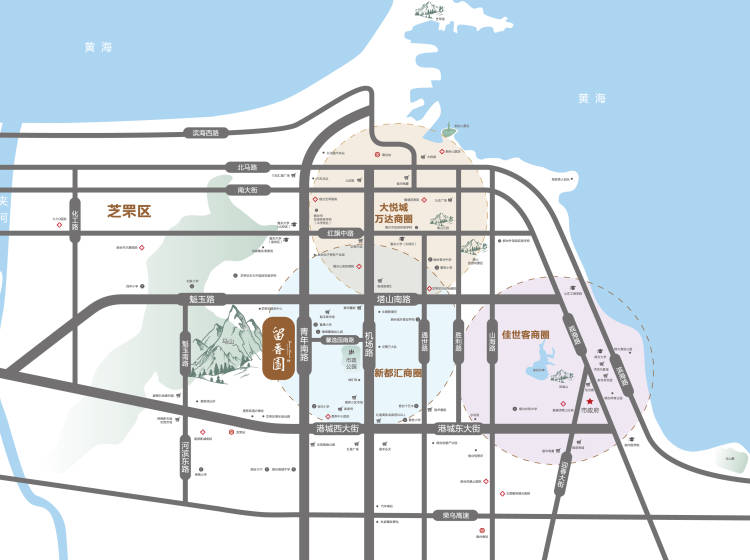 项目东侧紧邻青年南路是烟台市贯穿南北的主要干道,北侧约1公里是塔山南路的中心路段魁玉路,向北约6公里,就能到达烟台最繁华的商业街--南大街,享受振华、万达、大悦城等主要商圈,向北约7公里能够到达烟台火车站。向南约2公里直通港城西大街,项目南侧5公里到达杜家疃收费站连接荣乌高速,向南约6公里到达烟台高铁南站,多维交通自由畅行。
