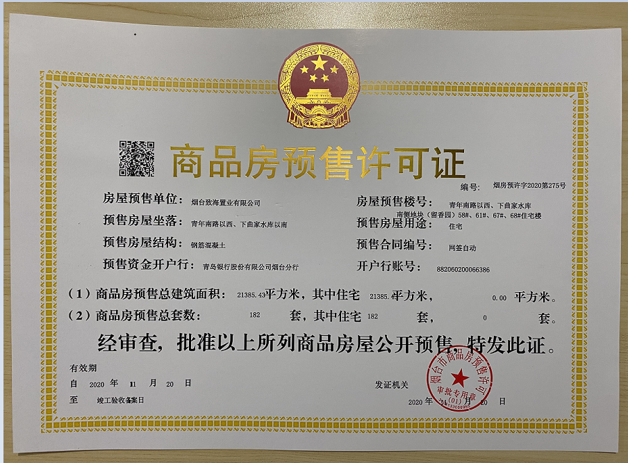 - 烟房预许字2020第275号 详情发证时间 2020-11-20绑定楼栋证件照片