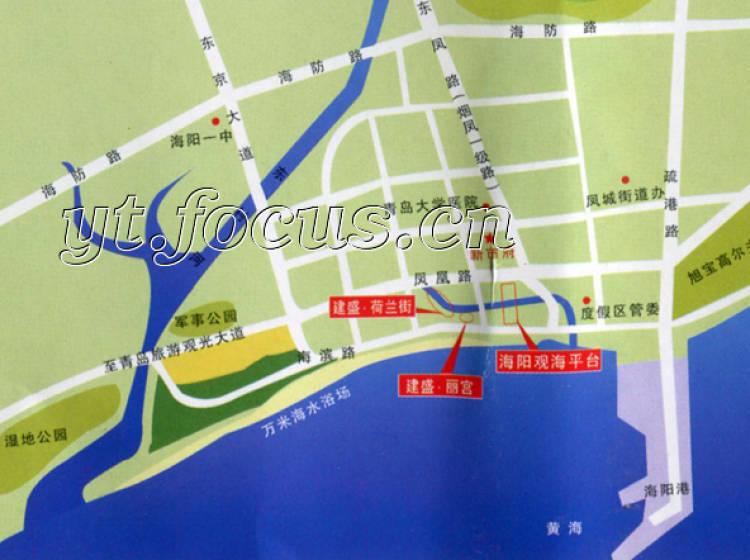 从海阳市內乘坐1、10路公交可到達萬米海灘浴場、国际沙雕艺术公園、海水温泉洗浴中心,乘坐2路公交可到達旭寶高爾夫球場,乘坐1路公交可到達遊艇俱乐部