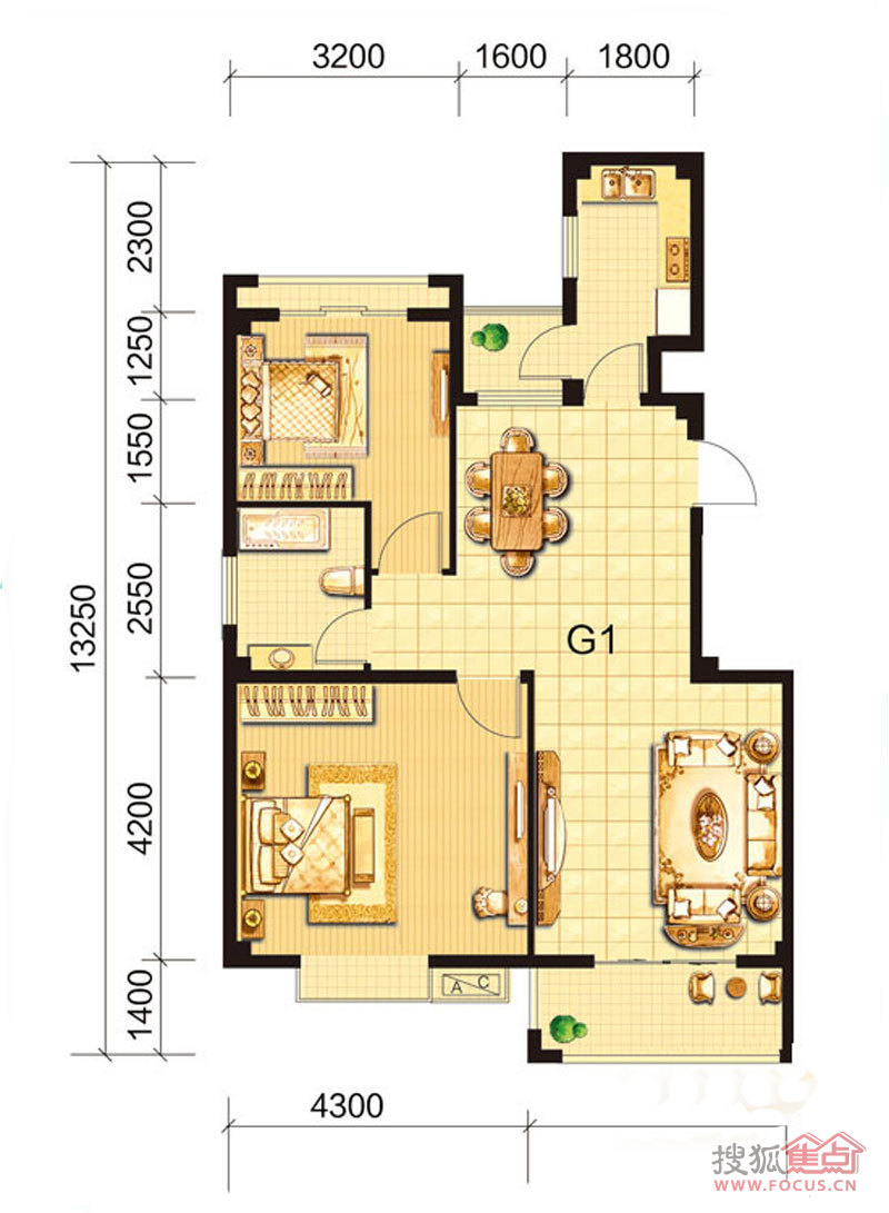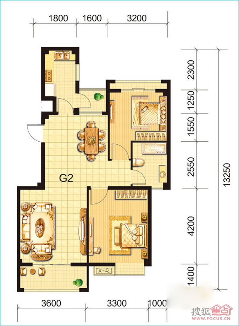 2室2厅1卫-佛光山水花园C区G1户型2室2厅1卫1厨