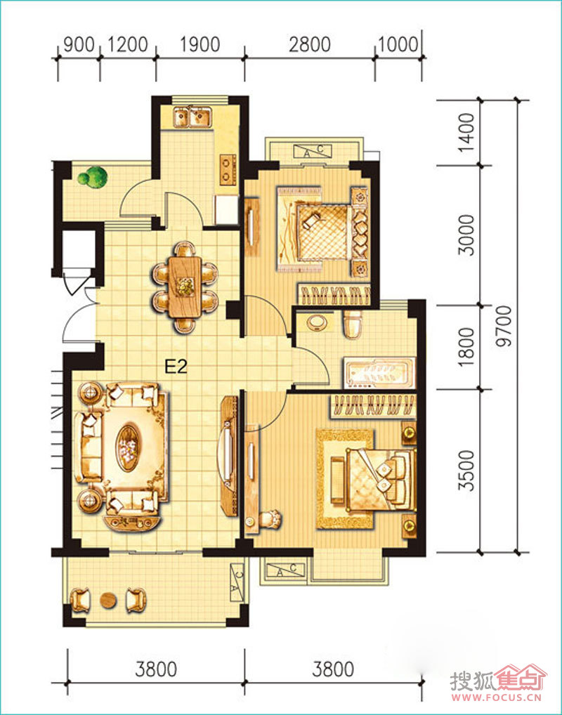 2室2厅1卫-佛光山水花园C区E2户型2室2厅1卫1厨