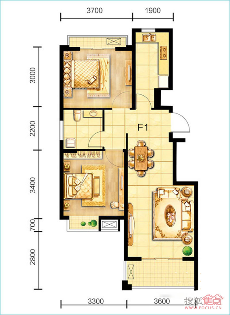 2室2厅1卫-佛光山水花园C区F户型2室2厅1卫1厨-75.28㎡