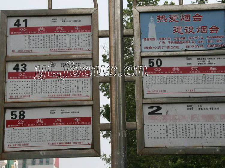 中国人民保险公司(公交站):1路;2路;5路;19路;19路(西海岸);31路;32路;38路;52路;61路;62路;烟台汽车总站·三联家电(公交站):2路;5路;41路;43路;61路;62路;D001路;高铁巴士2号线;烟台汽车总站(公交站):15路;19路;19路(西海岸);30路;43路;58路;58路(飞龙集团);62路;70路;机场巴士1号线;机场巴士烟台专线;御金台(公交站):1路;30路;31路;32路;38路;建设路(公交站):3路夜班区间;3路(港城西大街方向);3路(魁玉南路方向);6路;16路;中信银行(公交站):9路;9路谭家庄;12路;19路;19路(西海岸);45路;56路;烟台芝罘医院(公交站):3路夜班区间;3路(港城西大街方向);3路(魁玉南路方向);7路;16路;23路;27路;43路;58路;58路(飞龙集团);82路;烟台联通大楼(公交站):5路;9路;9路谭家庄;12路;32路;56路;61路;80路;三站国际小商品城(公交站):6路;49路;49路区间;肛肠病医院(公交站):3路夜班区间;3路(港城西大街方向);3路(魁玉南路方向);16路;27路;