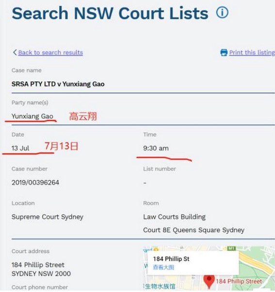 法官费根称,高云翔现已身在中国。“出于显而易见的原因,他不会希望返回这个国家(澳洲)”,去参加估计为期4天的民事案件聆讯。