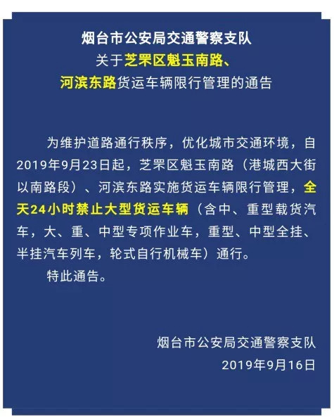 南口、北口禁止悬挂芝罘区及军、警号牌以外的各类摩托车通行,禁止悬挂芝罘区号牌的三轮摩托车通行;东口禁止悬挂军、警号牌以外的各类摩托车通行。