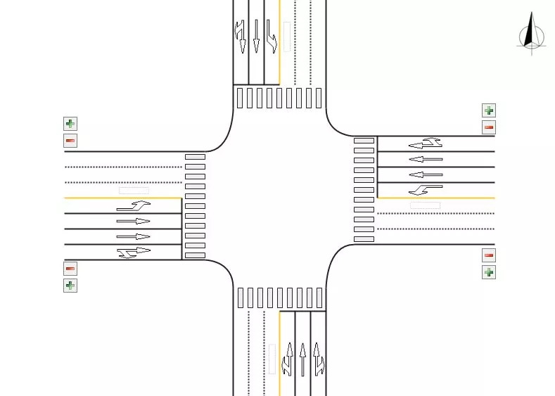 2、增加进口车道数通过实行路口护栏偏移和压缩非机动车道宽度,增加进口道车道数,东西进口车道由路段3车道变成路口5车道:左转-直行-直行-直行-右转;南进口由路段3车道变成路口5车道:左转-左转-直行-直行-直右;北进口由路段3车道变成路口5车道:左转-左转-直行-直行-右转。