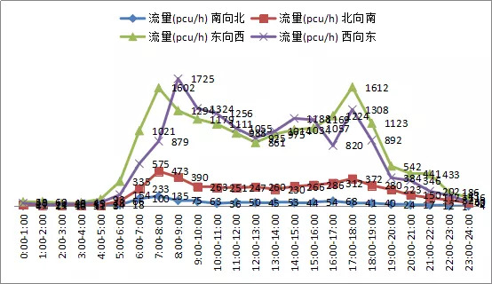 图中可以看出,港城西大街-魁玉南路路口南进口和北进口在7时至8时达到较大值,分别为233pcu/h和为575pcu/h;东进口在早高峰7时至8时流量较大,为1602pcu/h,晚高峰在17时至18时流量较大,为1612pcu/h;西进口在早高峰8时至9时流量较大,为1725pcu/h,晚高峰在17时至18时流量较大,为1224pcu/h。
