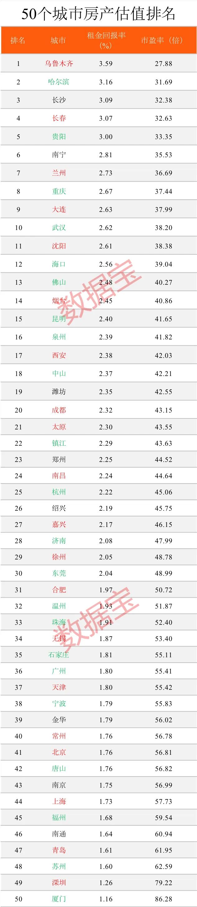 恒大研究院去年发布了我国较具发展潜力百强城市,数据宝对前50强城市的投资价值进行排名。