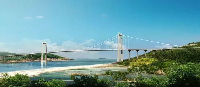 该项目是山东省较大跨径跨海悬索桥,起点位于威海乳山市大乳山猫头嘴,终点接G228丹东线烟台海阳市路段,路线全长4.01公里。项目采用双向四车道一级公路技术标准,设计速度80公里/小时。主桥宽度35.5米,按5万吨级船舶通航标准设计,主桥较高净空为51米,净宽565米。全线新建特大桥2430.4米/1座、大桥240米/1座、隧道100米/1座、养护工区1处、观景台4处。