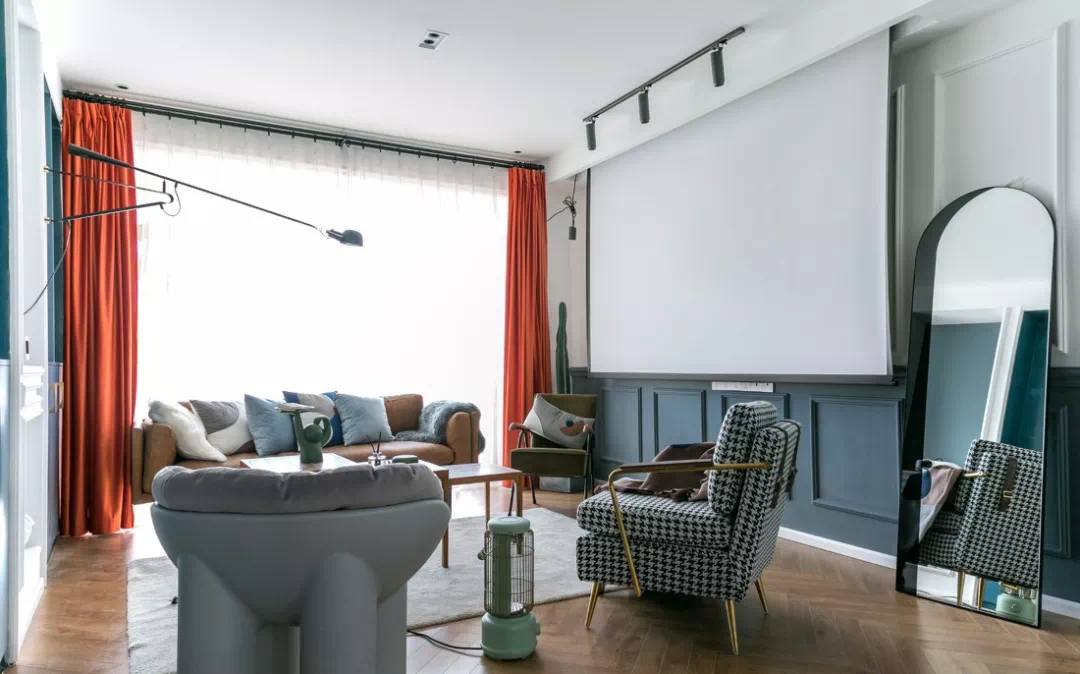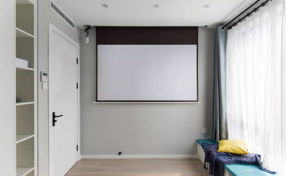 这种方式隐藏性好,收起来不占空间,不影响墙面收纳、猫爬架等等其他功能使用。但是装修前期要注意规划好投影幕布的位置与墙面的功用哦~