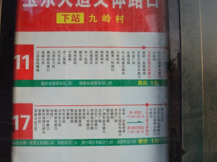 玉东大道文体路口(公交站):17路;文体路石棠路口(公交站):17路;富林·金桂丽湾(公交站):17路;和睦山村(公交站):11路;和睦村(公交站):11路;富林·金桂丽湾北(公交站):11路;文体路自强路口(公交站):5路;7路;17路;七冲村(公交站):11路;玉林高中新校区(公交站):5路;7路;17路;秀水路石棠路口(公交站):5路;17路;
