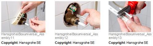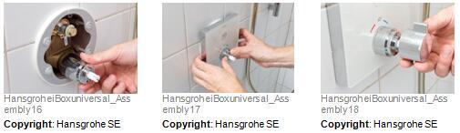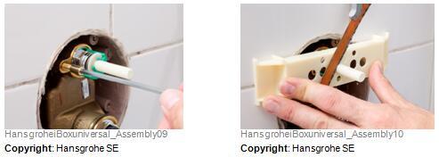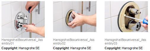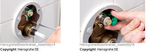 拆封较新预制汉斯格雅ShowerSelect恒温器组件。将较新功能组件安装在易宝 全能阀芯上并将四个螺钉拧紧。