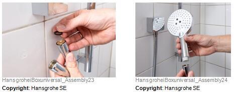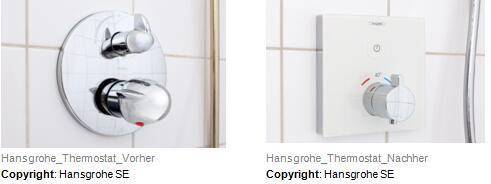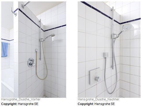 使用前后对比:翻修 15 年前的淋浴位置。在过去 15 年中经过反复试验,汉斯格雅易宝 全能阀芯可实现简洁、便利翻新。采用汉斯格雅Select技术的较新恒温器和淋浴装置可与汉斯格雅易宝 全能阀芯连接。客户对这种新增便利极为欢迎:只需触动按钮,不接触任何用电部件,即可控制头顶花洒和手持花洒。