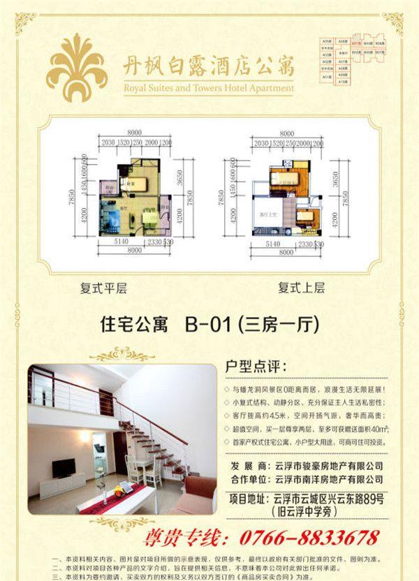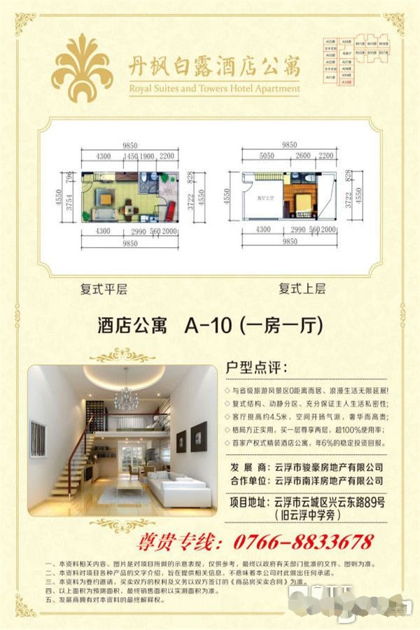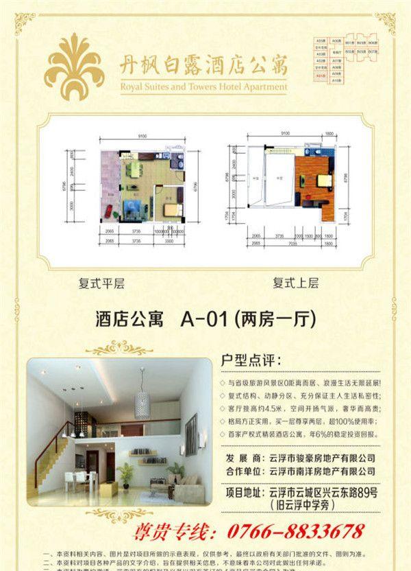 骏豪房地产打造丹枫白露酒店公寓,以“酒店式的服务,公寓式的管理”优越性和增值性,打造一座集酒店公寓、住宅公寓、商务办公三位一体的后现代之标志性建筑,领跑人居梦想标杆。同时利用“复式结构嫁接小户型“产品创新理念,以突破常规的空间创新,给云城带来具有个性的商务/生活形态。