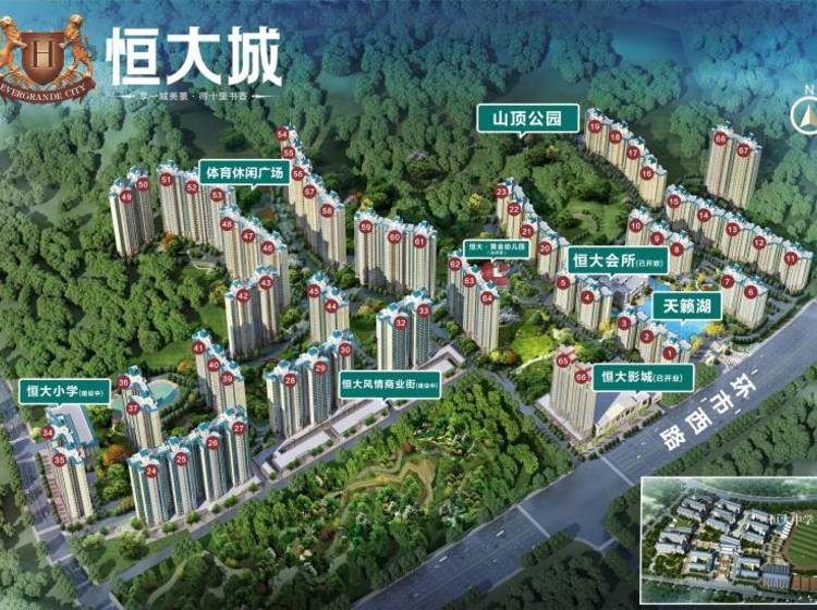 小区内部配套:80000㎡醉美园林、5000㎡天籁湖、200亩山顶公园、11500㎡恒大影城、11000㎡缤纷风情商业街、5200㎡恒大会所