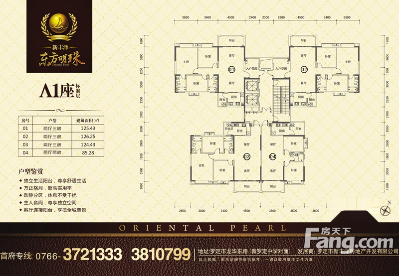 东方明珠花园商住小区位于罗定市龙华东路(罗定中学新校区对面) 项目规划用地面积104210㎡。拟建地面楼高17层至48层的35座(含22层酒店一座)、会所一座3层和居委会用房、物管房、配电房、公厕、垃圾房等平房各一座以及地下负一、二层等建筑群,钢筋混凝土框剪结构; 总建筑面积609800㎡,地上总建筑面积489648.8㎡,其中,住宅建筑面积419293.3㎡,商铺总建筑面积29568㎡,酒店总建筑面积27061.7㎡,会所建筑面积1669.5㎡,幼儿园面积3000㎡,架空层等建筑面积8355.6㎡,居委会、物管房等建筑面积700㎡;地下室建筑面积119697㎡。 一期规划用地面积21365㎡,拟建A1至A4、B1C1座高26层至28层的6座及会所1座3层建筑,框剪结构,总建筑面积98419.13㎡,其中,住宅面积72245.3㎡,商铺面积7754.13㎡,地下室面积15002.9㎡,停车位412辆。 项目总投资估算19亿元以上。建设工期:总体工程计划按7期开发分期建设,连续施工,逐期推进,用6至7年左右时间完成竣工整体工程建设。其中,一期项目于2012年7月开工,计划于2014年底竣工验收并交付使用。