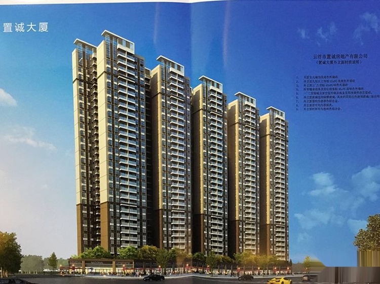 置诚大厦是云浮市置诚房地产开发有限公司投资开发的商住项目,总投资约3亿元,项目坐落于云浮市区中心地带,位于40米金山大道东侧,总用地面积5993.95平方米,《建设用地规划许可证》载明的规划设计条件为:容积率11;建筑密度56.7%;绿地率30%;建筑控制高度100米。 置诚大厦项目地处沿金山大道商业区,地理位置优越,交通便利,紧邻云浮碧桂园高尚住宅区,与凤凰酒店隔道相望,五百米半径范围内,大型社区、大型商业综合体、成熟商住区、汽车站、学校、幼儿园、菜市场健全,例如云浮碧桂园、臻汇园、帝景苑、京都花园、明珠花园、嘉乐园以及市汽车站新站和在建中的沃尔玛商业综合体等项目都坐落于金山大道附近。 置诚大厦规划楼高30层,地下负一、负二、负三层地下车库,地上首层为商铺,二层架空作绿化,三层以上为住宅。该项目总建筑面积82115.5平方米,住房总数546户,配套小车停车位402个。