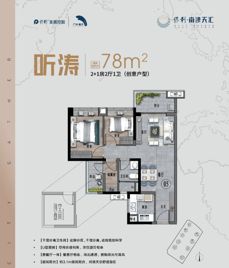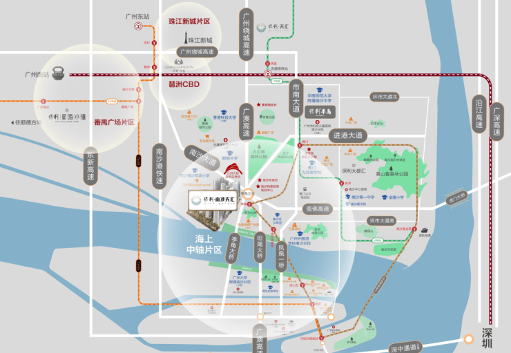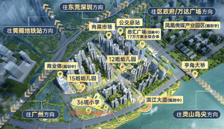 商业:自建 + 周边,量级足够 自持商业:配建 17 万㎡保利叁汇商业体,是片区少有的大型自持商业,未来会引进超市、影院、餐饮,填补片区中高端消费空白,目前暂未开业。 周边商圈:2.2 公里到南沙悦方城,5 公里内有星河 COCO Park、南沙环宇城、万达广场、灵山岛地下商城,五大商圈环绕,日常购物、聚餐完全够用。